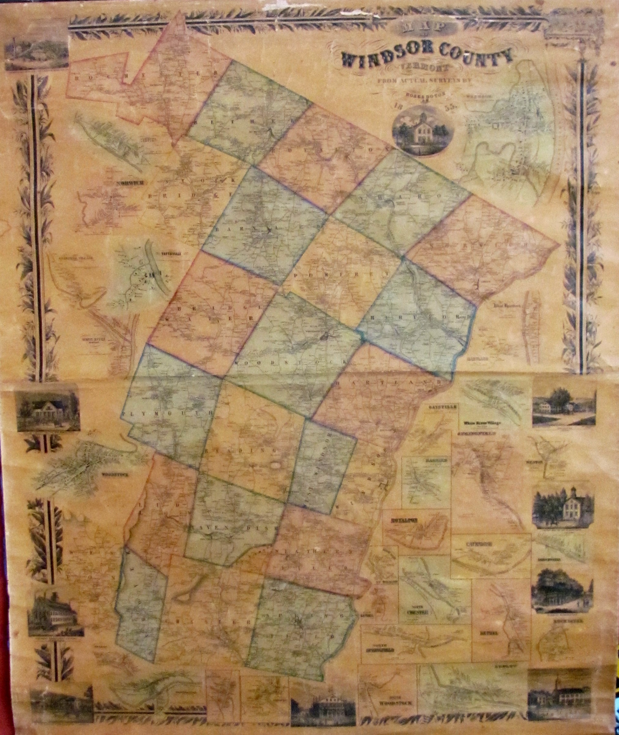 Last week, I wrote about Chester Historical Society’s loan of artifacts for the newly renovated upstairs of the Chester Town Hall. Continuing along that line, here is some history of the 1855 Doton map of Windsor County, now upstairs at town hall. We had this map shadow box framed and archivally preserved at the Framery of Vermont.